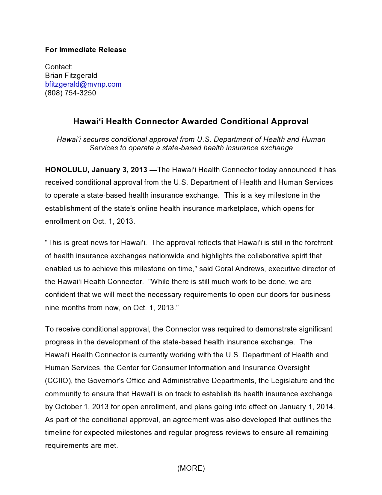 Hawaiʻi Health Connector Awarded Conditional Approval
