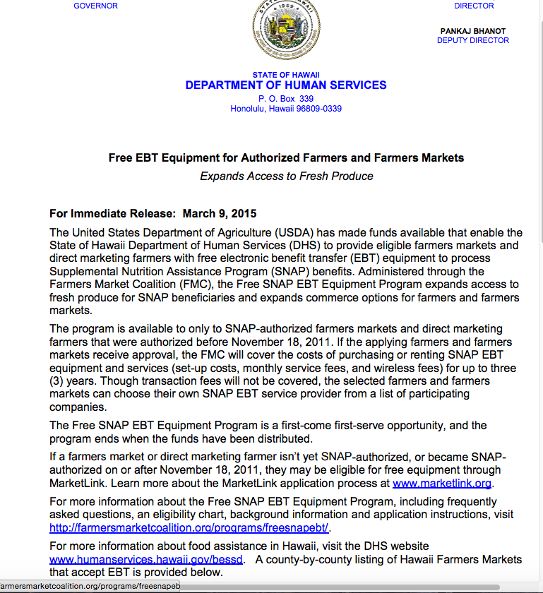 FREE EBT EQUIPMENT FOR AUTHORIZED FARMERS AND FARMERS MARKETS