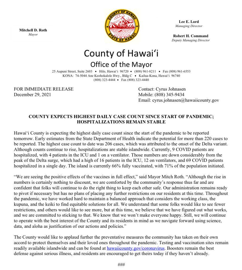 Mayor Mitch Roth announces the termination of Hawaiʻi County’s Thirteenth Supplementary Emergency Proclamation, declaring an end to all County emergency rules related to COVID-19. As a result, effective immediately, there will no longer be a limit on gathering sizes (indoor and outdoor), which ultimately removes the County’s coveted mechanism for ‘special gatherings’ review and approval. However, residents must still adhere to the Governor’s Emergency Proclamation Related to COVID-19 (Omicron Variant), which includes indoor mask-wearing, Safe Travels requirements, and testing/vaccination requirements for County and State employees. The Governor’s emergency order will remain in effect until March 25 unless otherwise acted upon. It is unclear if the Governor will extend his emergency rules beyond then.